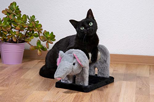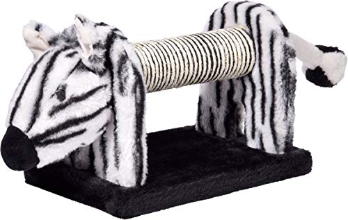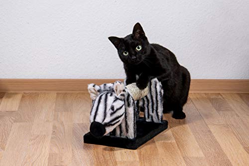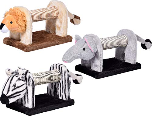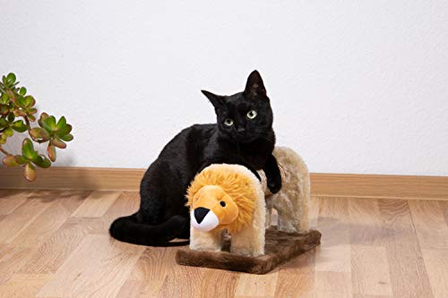 Con estos originales rascadores podrás disfrutar de la pista salvaje en el salón de casa. Las tres figuras de animales están inspiradas en los populares animales sabanas africanos, cebra, elefante y león. Las medidas de aprox. Rodillo rascador de 16 cm de largo en el centro (diámetro aprox. 5,5 cm) está envuelta con sisal y es ideal para el cuidado de las uñas de tu tigre. La cabeza (longitud aprox. 10 cm) y la cola (longitud aprox. 18 cm) están cada uno recubiertos con felpa mullida. En la cola de los animales se encuentra además un sonajero que invita a jugar y retocar. Pero incluso si las bonitas figuras de animales no están en contra de su mascota, son un verdadero punto de atracción en su hogar. Los juguetes para gatos están hechos de madera MDF resistente y aguantan con un peso de aprox. 1 kg. La gran placa inferior mide aprox. 27 x 16,5 x 1,6 cm (largo x ancho x alto) y ofrece un soporte seguro. La longitud total de cada animal es de aprox. 51 cm.