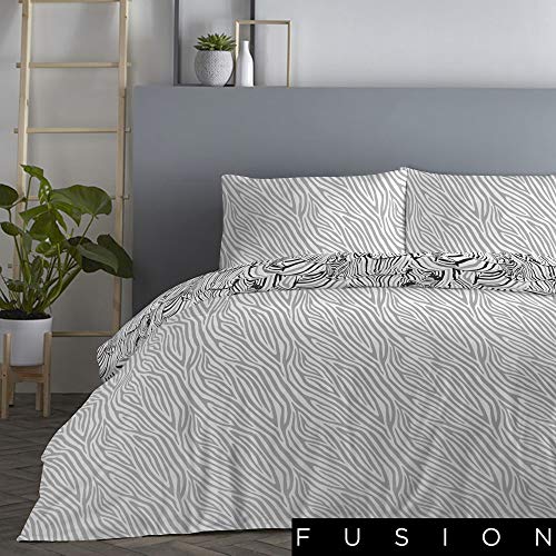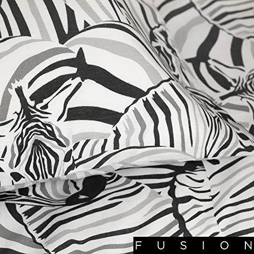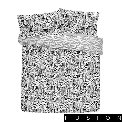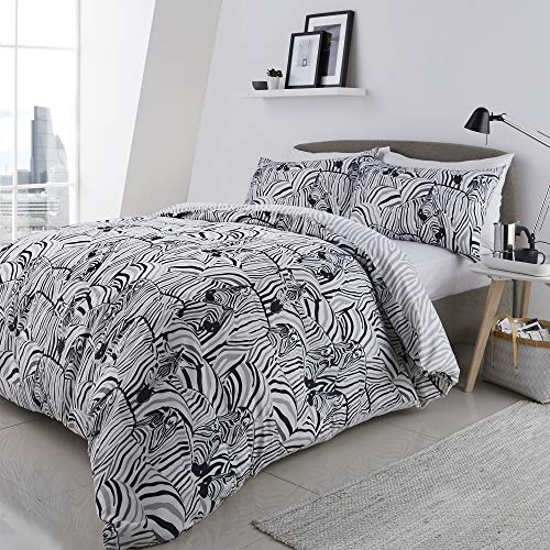 Un popular juego de funda de edredón con patrón de piel de cebra en blanco y negro, una tendencia clave en el diseño reciente del hogar. Mira de cerca sin embargo para ver las discretas cebras ocultas en el diseño. Impreso en polialgodón de fácil cuidado, esta ropa de cama se puede invertir para mostrar un patrón de cebra gris y blanco para un aspecto alternativo.