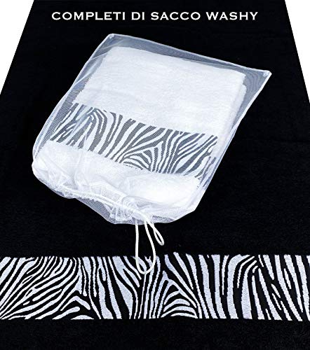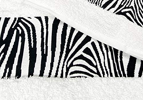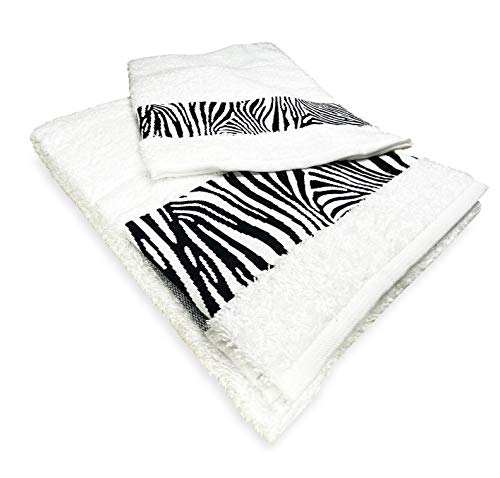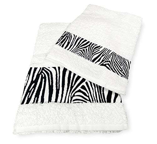 El juego se compone de 1 toalla y 1 toalla de invitados de rizo liso de algodón 100 % de buena consistencia en un elegante diseño de cebra en el volante construidos totalmente en bastidor.